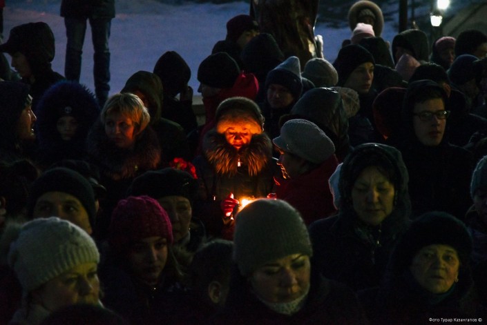 В какой-то момент люди включили фонарики на своих смартфонах и подняли руки вверх. Таким образом они почтили память всех погибших в Кемерово.