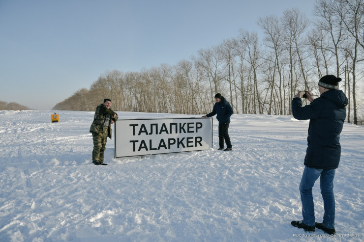 Люди проезжают по трассе, останавливаются и делают фото с надписью "Талапкер".