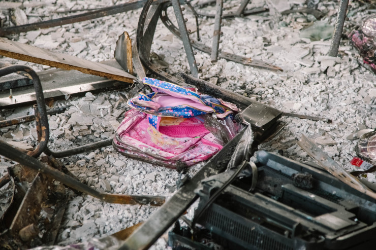 Среди черных обломков зданий то здесь, то там в глаза бросаются яркие детали - детские игрушки, разорванная одежда. От этого становится жутко.