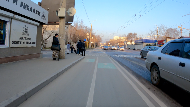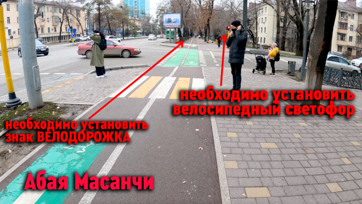 Необходимо или закрасить эту крайнюю правую полосу красной краской, или сделать кусочек велополосы из нее, который будет после Манаса продолжаться.