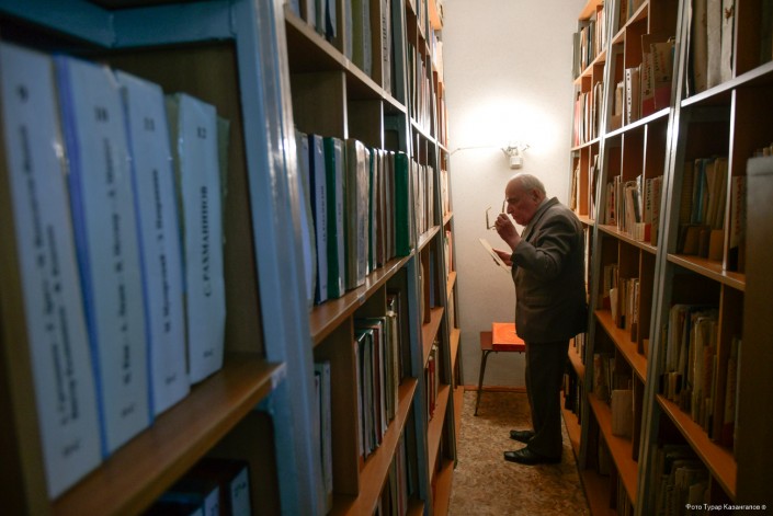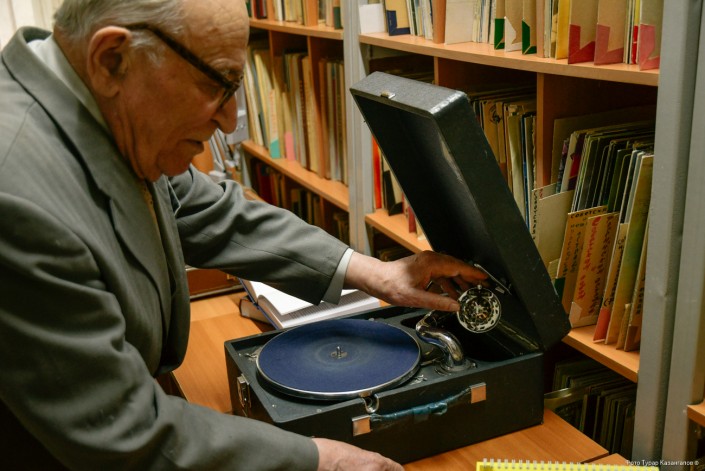 Шафер садится поудобнее и с большим удовольствием слушает на патефоне запись с голосом Куляш Байсеитовой. "Ария Ажар из оперы Жубанова "Абай". Пластинка 40-х годов", - уточняет для нас пенсионер. По комнате разносится звонкий женский голос с характерным патефонным шуршанием. "Пластинки хранят звук вечно", - скажет Наум Григорьевич после прослушивания.