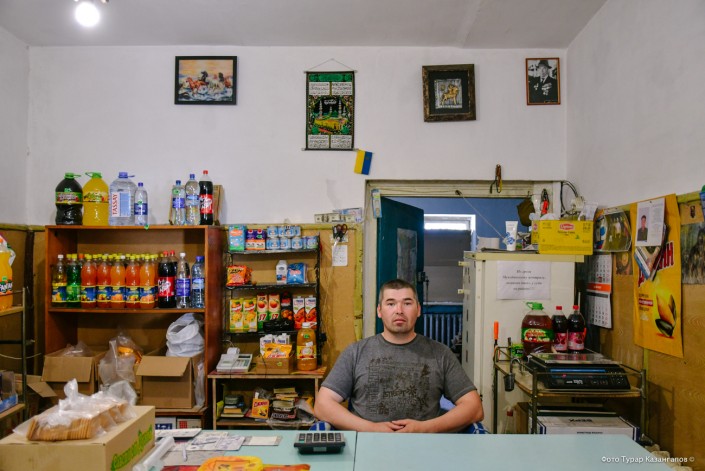 За прилавком этого магазина - местный житель Нариман Мусабаев. Помимо надписи про "Муялдинский централ", на его рабочем месте можно заметить портрет мужчины в шляпе и с орденами. Это дед Наримана. Он участник Великой Отечественной войны. Внук им очень гордится.