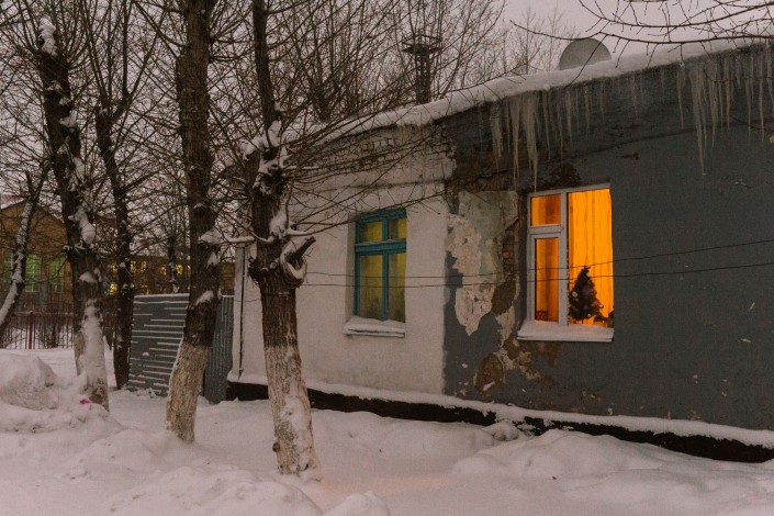 На Лесозаводе люди сами себе создают праздничное настроение, каждый в отдельно взятой квартире. Вон, на окна кто-то наклеил снежинки.