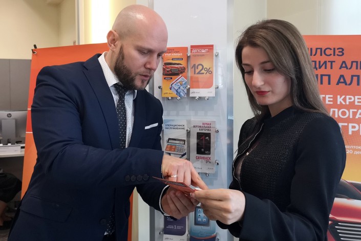 Вручив вертикальную карту № 1 новому клиенту, Руслан Волынец отметил, что теперь Татьяна может бесплатно снимать до 300 тысяч тенге в месяц в любом банкомате по всему миру.