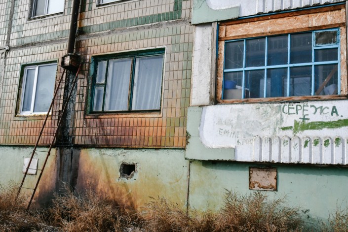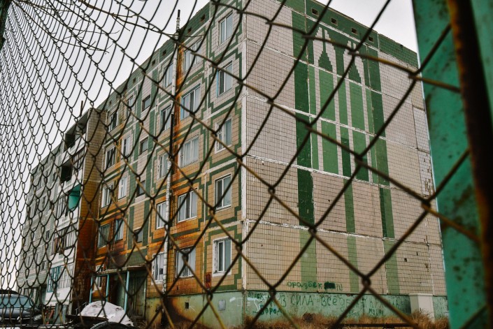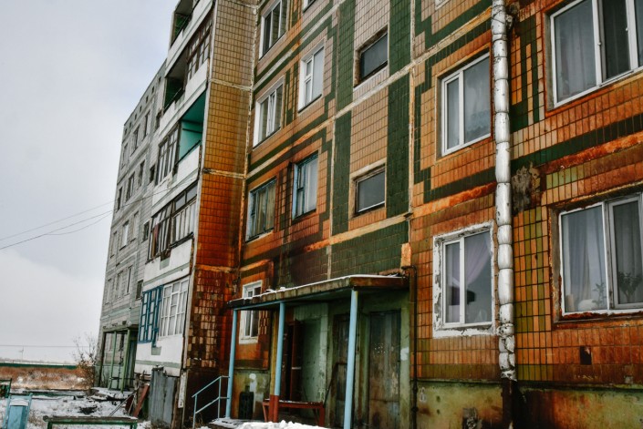 Даже издалека на единственной пятиэтажке в Автоматике можно разглядеть желтые и коричневые пятна. Это последствия отключения дома от центрального отопления.