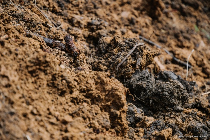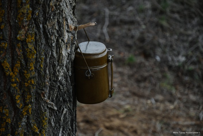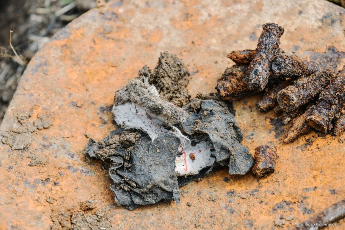 "Прошлись металлоискателем - вроде что-то зазвенело, копнули чуть - нашли краешек каски", - рассказывает молодой поисковик Руслан Нурпеисов.