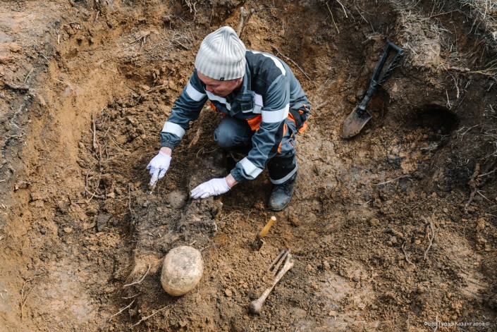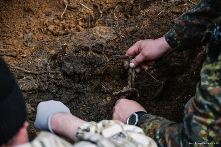 Мужчина бережно, слой за слоем снимает глинистую землю, под которой находятся останки советского бойца. В том, что эти воины были именно советскими, у поисковиков нет никаких сомнений.