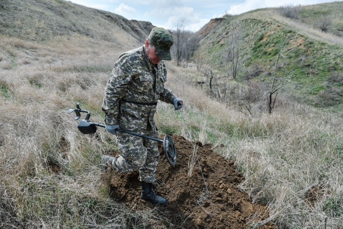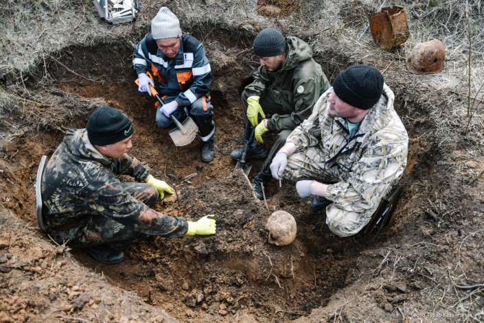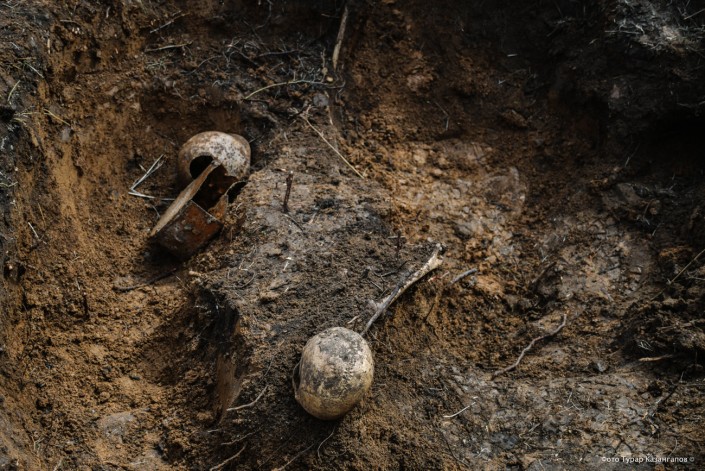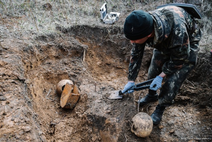 "Мы делаем святое дело, мы поднимаем этих бойцов, которые остались здесь. Они погибли, отдали свою жизнь за наш мир, за наше счастье, за семейный очаг, за родину, и мы отдаем им должное, чтобы их захоронить по человечески, не так, чтобы они лежали здесь в полях, никому не нужные и брошенные. Вот их душа дождалась нас, и я, наверное, на 100 процентов уверен, что это казах, потому что казахстанцы пришли и нашли его здесь", - говорит поисковик.