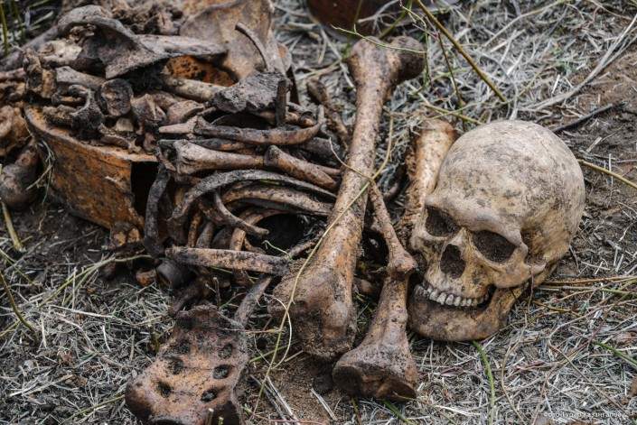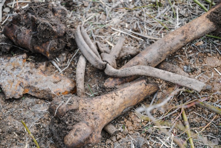 Чуть позже поисковики обнаружили еще один скелет, и тут же появилась версия: "Боец раненого нес, потом авиабомбой обоих убило, и они вдвоем свалились сюда".