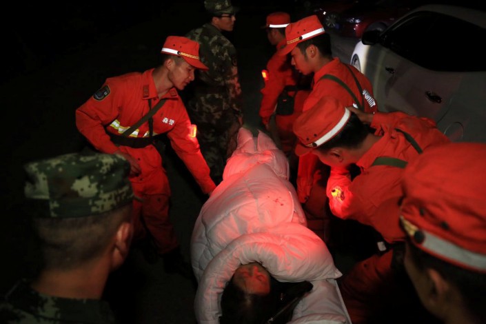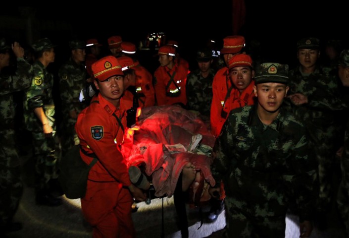 Военнослужащие из военизированных формирований Китая выносят пострадавшего после землетрясения.