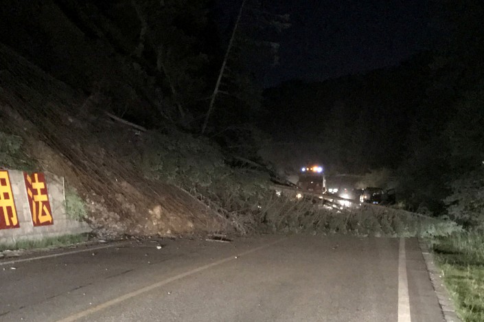Трещина на дороге после землетрясения в округе Цзючжайгоу, префектура Нгава, провинция Сычуань.
