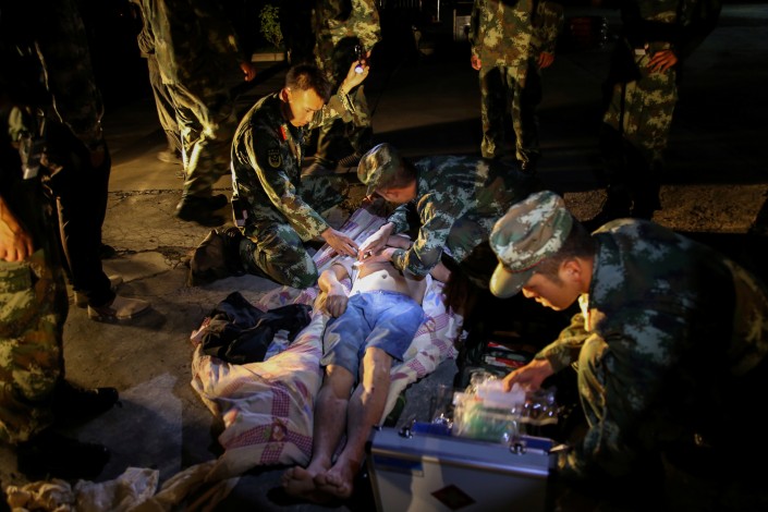 Военизированная полиция Китая оказывает первую помощь выжившему после землетрясения в округе Цзючжайгоу.