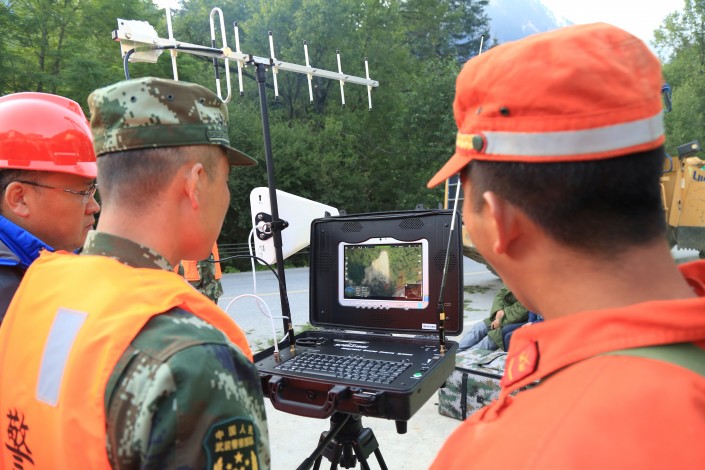 Китайская военизированная полиция использует дрон для определения последствий землетрясения.