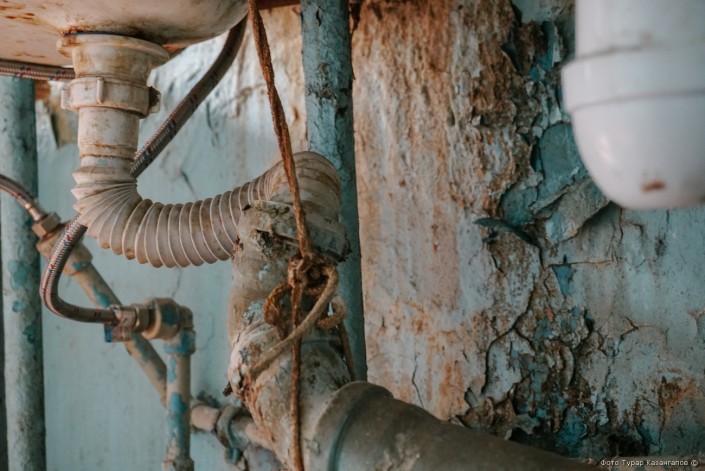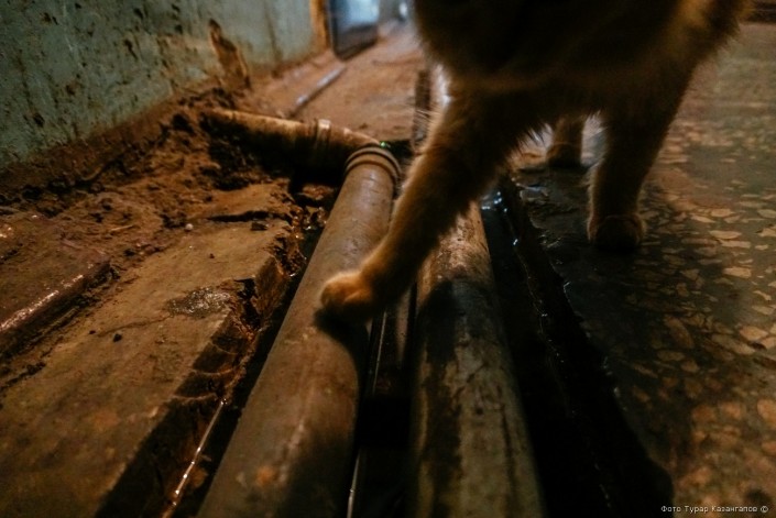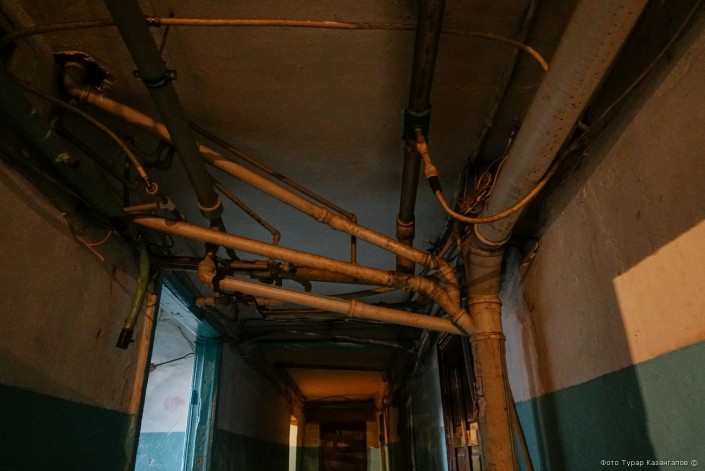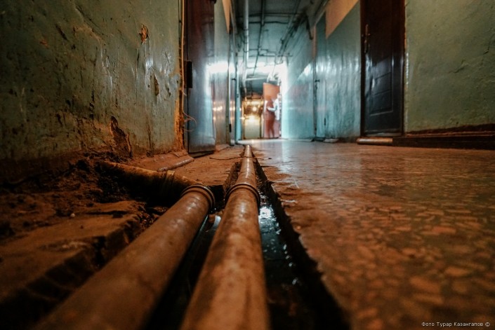 Первый этаж общежития снизу и сверху окутан трубами, которые постоянно издают характерное журчание.