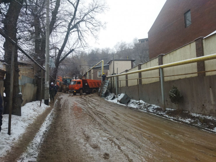Собравшиеся на месте жители соседних домов рассказали журналистам, что строительство соседних домов происходило хаотично, водопровод прокладывается без согласования в "Горводоканалом".