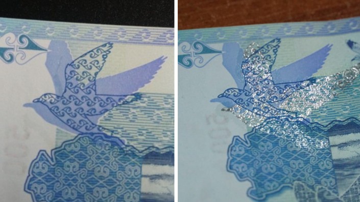 Обратите внимание на изображение чайки в левой верхней половине купюры. На второй банкноте отсутствует фольгированный рисунок.