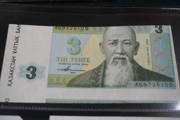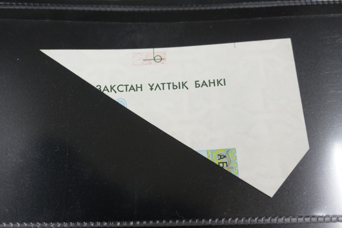 "Вот "высочайшее" качество полиграфии английской банкнотой фабрики Harrison & Sons. Вот, как видите, там наверняка торопились сделать заказ и получить деньги от Казахстана - результат налицо", - говорит коллекционер, демонстрируя обрезанную по верхнему краю банкноту.