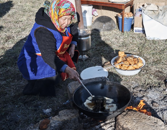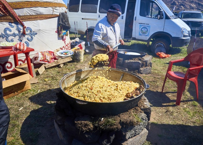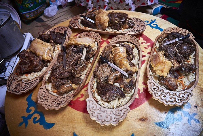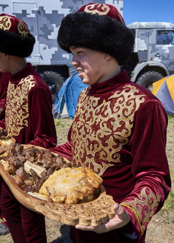 Впрочем национальными блюдами здесь угощали всех - в юртах можно было попробовать мясо по казахски, куырдак, сирне и кумыс.