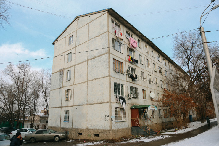 Сам дом - это приватизированное общежитие, которое находится на оживленной улице Жубанова, рядом с пересечением с улицей Саина.