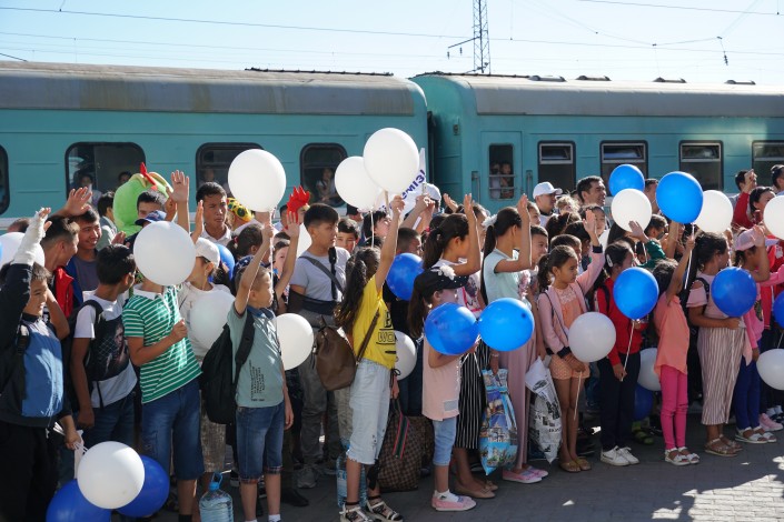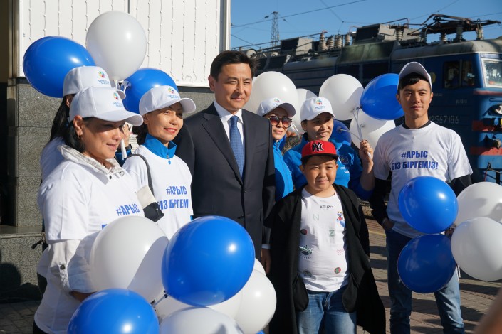 Детей из пострадавшего от взрывов города готовились встречать с раннего утра. Еще задолго до прибытия заветного поезда на вокзал стали стягиваться волонтеры в футболках с надписью "Арыс, бiз бiргемiз" (Арысь, мы вместе).