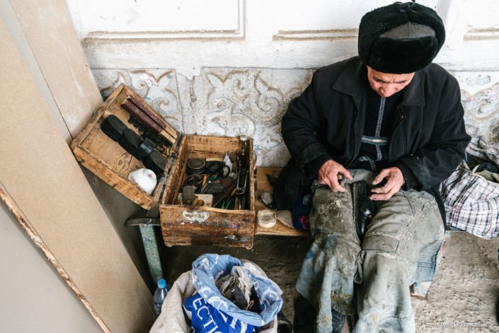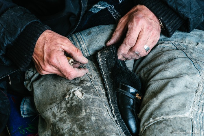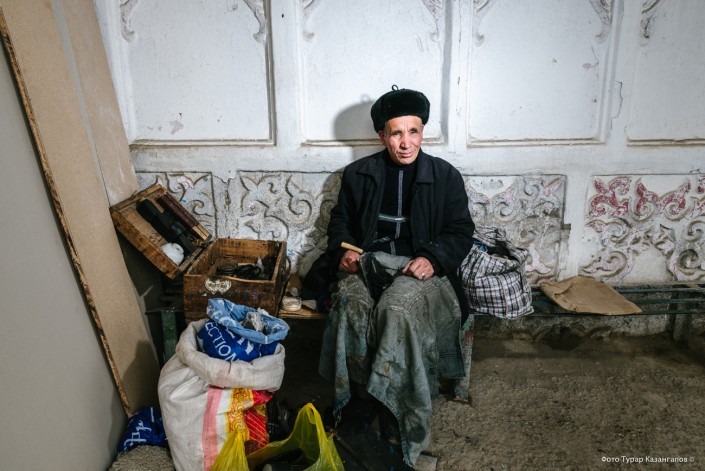 Это местный сапожник Тоулебай Джумамухамбет. Он оралман, вначале 90-х годов приехал в Казахстан из Ирана.