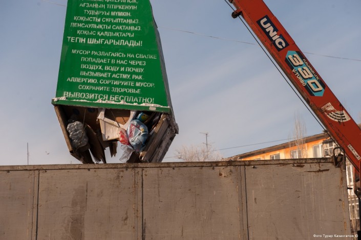 "Дизайн и форма наших контейнеров не позволяет содержимому при сильном ветре разлетаться по дворам. Решили немного креативнее подойти: глаза, руки нарисовали, написали "Накорми меня". Чтобы люди запоминали, чтобы их мотивировать сортировать мусор", - делится директор ТОО "ТТК" Еркин Мукаев. В "мусорном" бизнесе он работает уже долгое время. Больше всего усилий компания вкладывает в пропаганду раздельной сортировки мусора самими жителями.