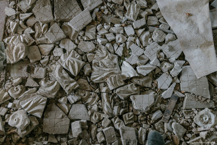 Повсюду битое стекло, фрагменты гипса и нецензурные надписи на стенах.
