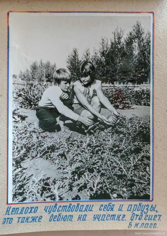На верхнем фото - шестиклассница держит в руках маленький арбуз, который вырастили на пришкольном участке.