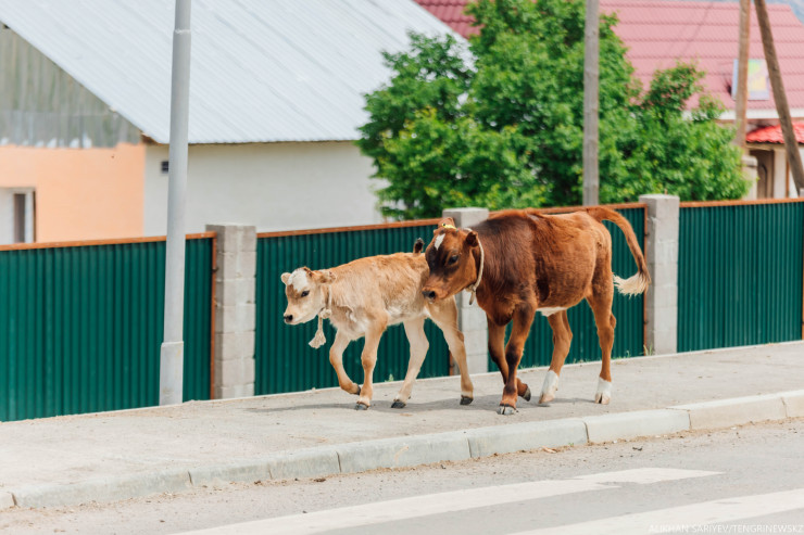 Самый распространенный дорожный знак, который нам встречался, - это "домашние животные". Как нам рассказали, раньше здесь был колхоз, а когда он развалился, чтобы как-то выжить, местные свой скот распродавали. Сейчас же, наоборот, у сельчан свое крестьянское хозяйство, они держат коров, баранов, лошадей.
