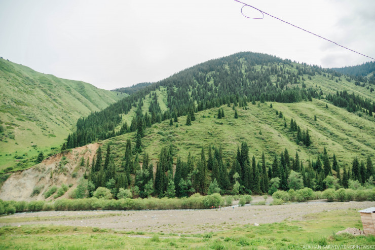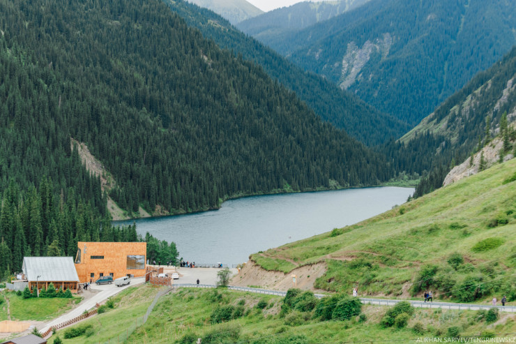 Мы поднимаемся в сторону озер, впереди шлагбаум, но охранник не обращает на нас никакого внимания, он молча пропускает нашу машину. Дорога до самого Кольсая и правда хорошая. Можно доехать за 15 минут. Делаем остановку на поляне с юртами.