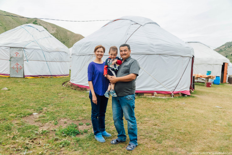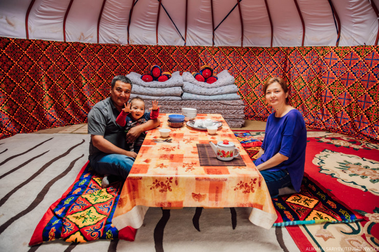 Заходим в первую попавшуюся юрту, здесь живет гостеприимная семейная пара Алмаз и Айнур. Еще четыре юрты они сдают в аренду. Их бизнесу почти два года.