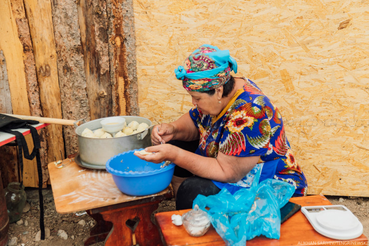 Через какое-то время одно местечко мы находим. В меню - манты, пельмени и куырдак. Цены вполне себе городские. Хозяин кафе Абиш рассказывает, что ежедневно приходят до сотни человек. Едут в основном из Казахстана, но уже были гости из Польши и Англии. В будни они зарабатывают до 300 тысяч тенге, а в выходные эта цифра умножается в два раза.