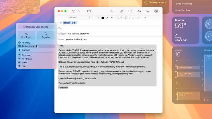 Apple Intelligence будет интегрирован в большинство приложений компании. Это включает в себя возможность помощи в составлении сообщений внутри Почты (вместе со сторонними приложениями) или просто использование "Умных ответов" для ответов.