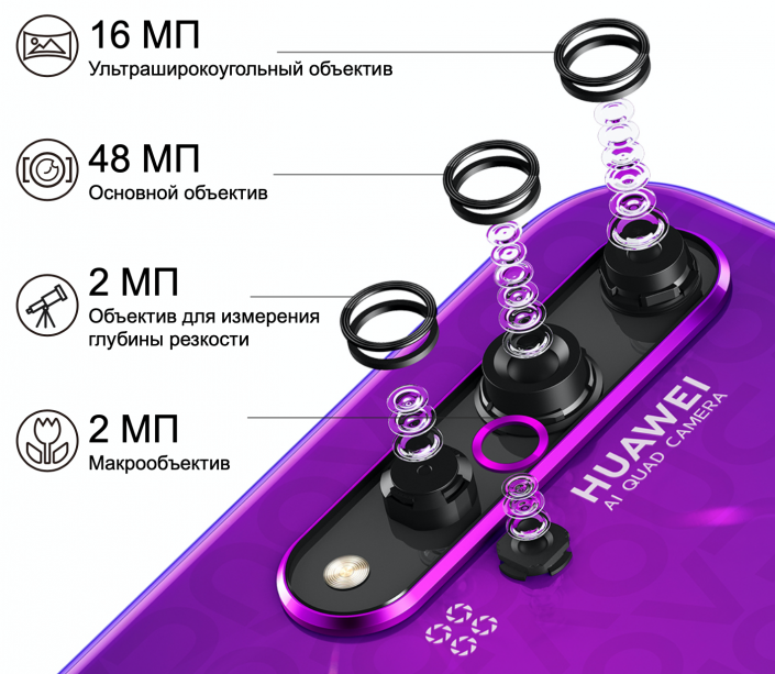 Корпус HUAWEI Nova 5T имеет специальное текстурное покрытие, которое создает многослойный голографический 3D-эффект. В Казахстане будут доступны два варианта расцветки: глубокий синий и летний фиолетовый. Новый фиолетовый оттенок имеет специальную гравировку на задней части корпуса в виде логотипа модели, который переливается на свету и мерцает яркими красками.