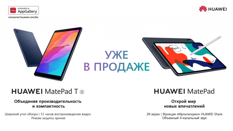 Новинки доступны в продаже во всех крупных сетях электронной техники с 28 августа в сером цвете по рекомендованной цене: HUAWEI MatePad T8 - 69 990 тенге и HUAWEI MatePad - 139 990 тенге.