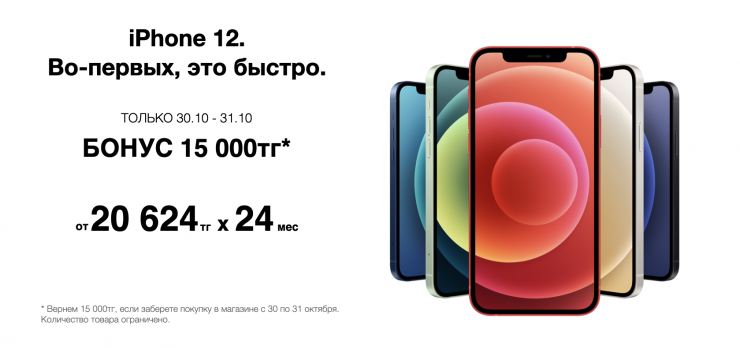 Если забирать новенький iPhone 12 из магазинов Technodom, Sulpak, Mechta, Fora, Evrika в вашем городе 30 либо 31 октября, вам не только помогут его настроить, но и начислят дополнительный бонус в 15 000 тенге!