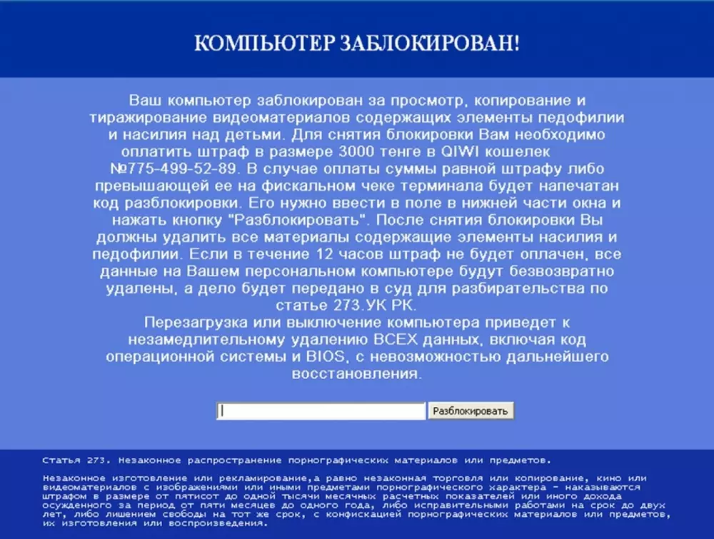 Эксперт рассказал, что речь идет о зловреде Trojan-Ransom.Win32.PornoAsset. После заражения на экран выводится окно с предупреждением о том, что компьютер заблокирован за просмотр, копирование и распространение запрещенного контента, например, детской порнографии. Для снятия блокировки пользователю предлагается перевести на счет мошенников сумму от трех до пяти тысяч тенге. После транзакции они обещают прислать своей жертве код разблокировки. Вирус предупреждает, что если штраф не будет уплачен, то информация о пользователе будет передана в суд.