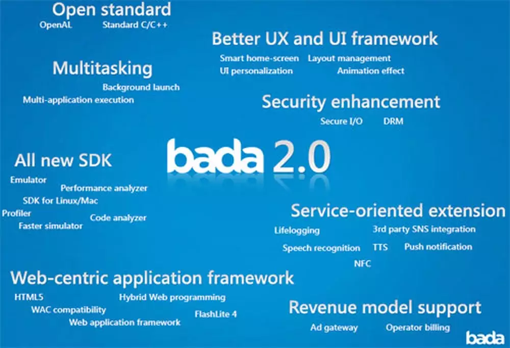 Новая версии мобильной платформы будет представлена в третьем квартале этого года. По заверению разработчика, Bada 2.0 получит улучшенный интерфейс и более тесную интеграцию с социальными сервисами. Кроме того, заявлена поддержка функции многозадачности.