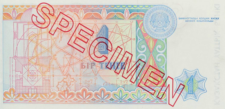 Оборотная сторона: преобладающий цвет – розовый. Основные изображения – геометрические конструкции и формулы Аль-Фараби.