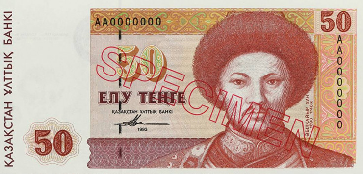 Лицевая сторона: преобладающие цвета – красный и коричневый. Основное изображение – портрет государственного деятеля, полководца, первого хана Младшего жуза Абулхаир-хана (1693-1748).