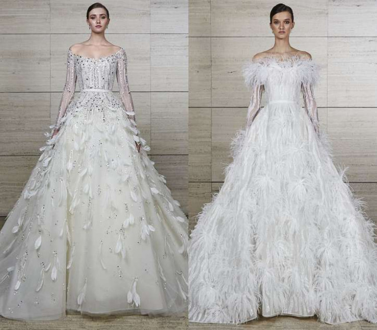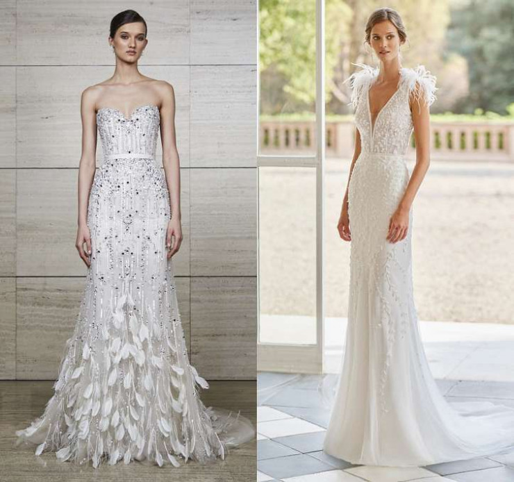 Во время локдауна многие пары вынуждены были отложить на время свадебные торжества. И теперь, когда вновь можно провести масштабную свадьбу, они хотят "компенсации". И тенденции свадебных платьев откликнулись на это волной эффектных моделей, декорированных перьями. Подобные были замечены в коллекциях Elie Saab, Naeem Khan и Rosa Clara