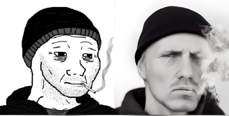 Один из самых популярных думеров с сигаретой был первым, кого попытались воссоздать. В версиях искусственного интеллекта думер с сигаретой превратился в грустного Райана Гослинга. Вспомнить только кадр из фильма "Драйв" и курящего Райана за рулем Chevrolet Chevelle Malibu 1973 года выпуска.