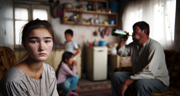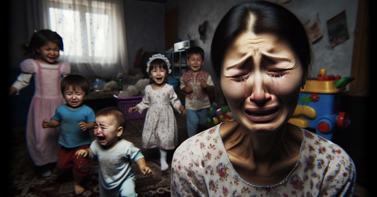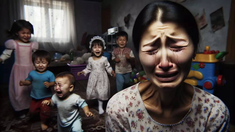 Картины получились разнообразными, и если на первых двух изображены женщины-мамы, не скрывающие своих эмоций и чувств, то в следующем кадре дела обстоят немного иначе. "Хладнокровное" изображение показывает казахстанку, которая маскирует следы побоев на лице.