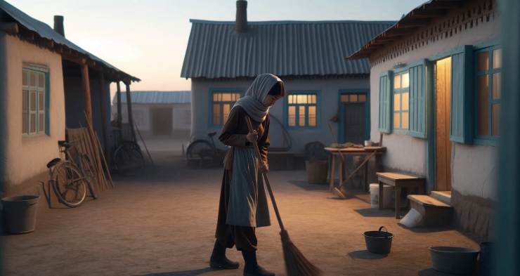 До глубины души тронула пользователей и следующая картина. В ней автор изобразил быт келин, в одиночестве убирающей двор. Эту работу, как пишут пользователи, сложно назвать женской, тем не менее мести двор стало привычным делом для многих девушек, проживающих в регионах Казахстана.