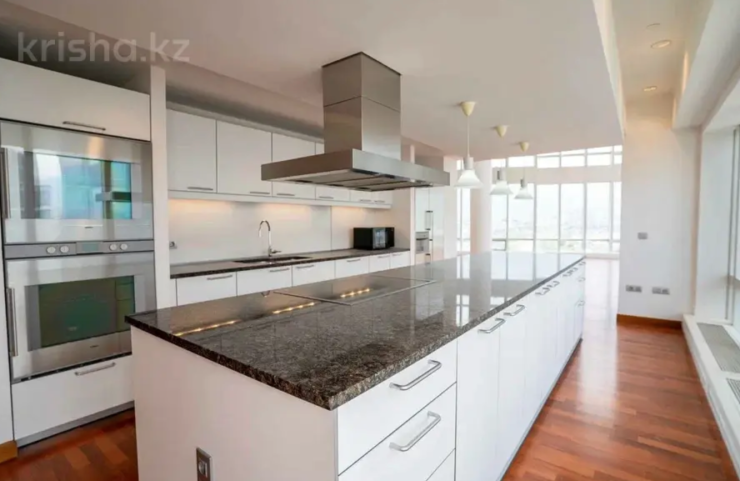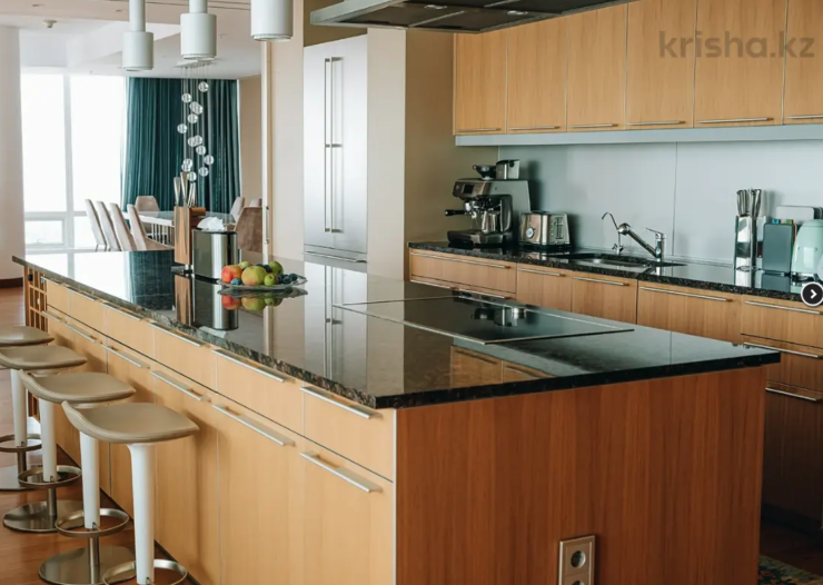 Просторная квартира за 1,1 миллиарда тенге расположилась на набережной реки Есентай. В ней есть большая, просторная гостиная, три спальни с отдельными санузлами, а также гардеробом. В квартире также есть кабинет, винный шкаф, светлая кухня с выходом на террасу.