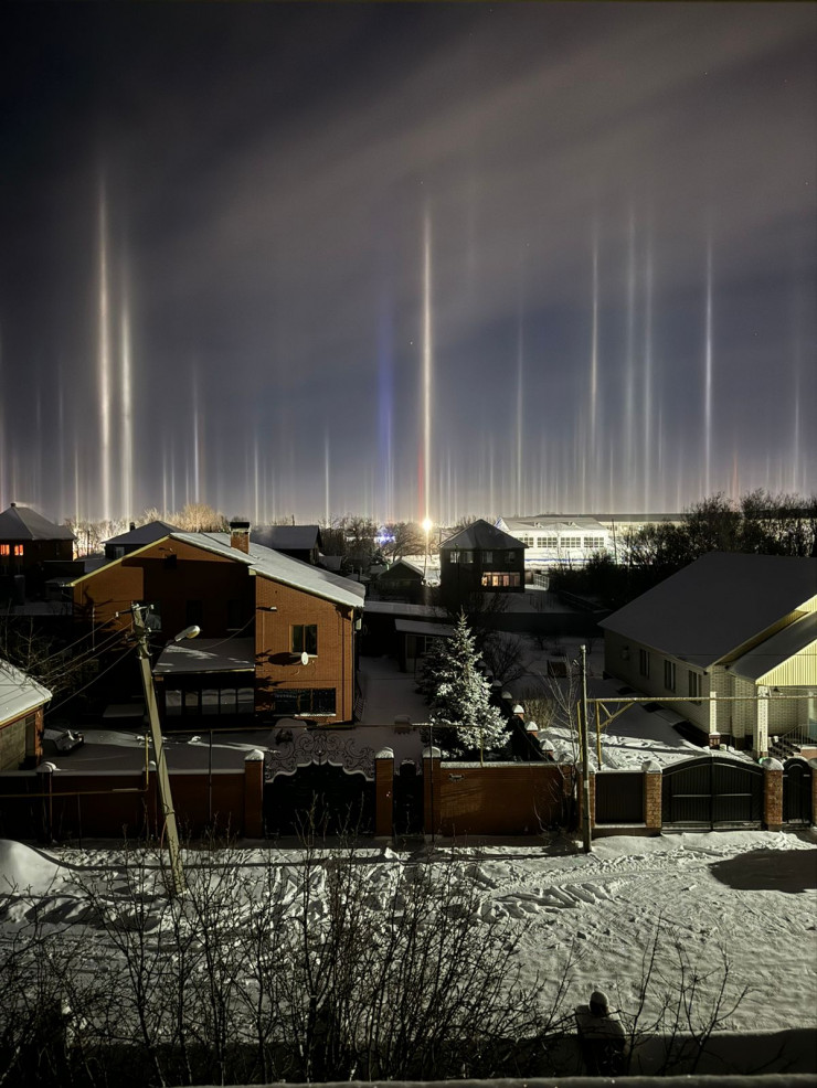 Световые колонны, тянущиеся от источников света, объясняются процессами, происходящими высоко в атмосфере. Оптический эффект возникает при отражении лучей от ледяных кристаллов, парящих в воздухе.