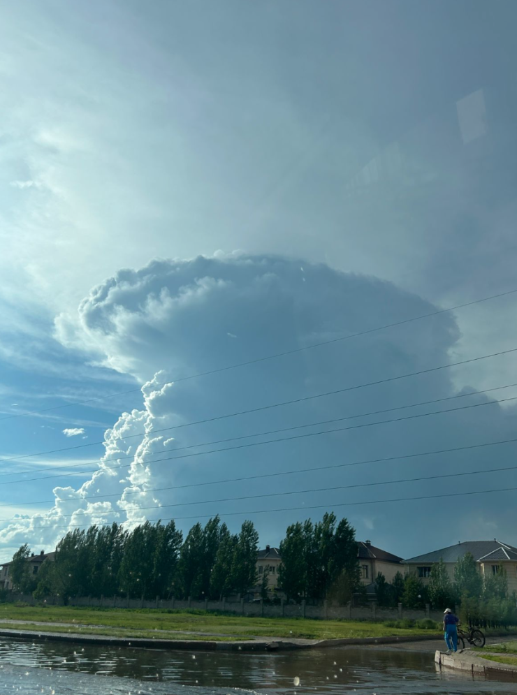 Астана славится своими багровыми, фиолетовыми, очень живописными закатами. Часто пользователи сети отмечают, что ждут лето из-за самых красивых закатов, которые можно увидеть в столице. Сегодня жители стали свидетелями другого явления, а именно гигантского облака, которое по форме напоминает то ли цунами, то ли воронку смерча. Снимки были присланы читателями на наш редакционный WhatsApp-номер +7 777 001 44 99.