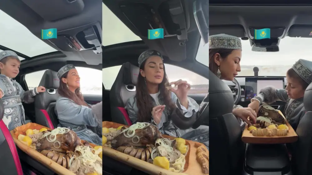 На 30-летнюю казахстанку Дарью Наурузбаеву обратили внимание пользователи сети из-за ролика, где девушка представила казахскую версию популярного тренда. В своем ролике, набравшем более 2,3 миллиона просмотров, девушка предстала в национальном костюме за рулем автомобиля вместе со своим сыном. Завершился ролик неожиданно - традиционной трапезой - они ели бешбармак.