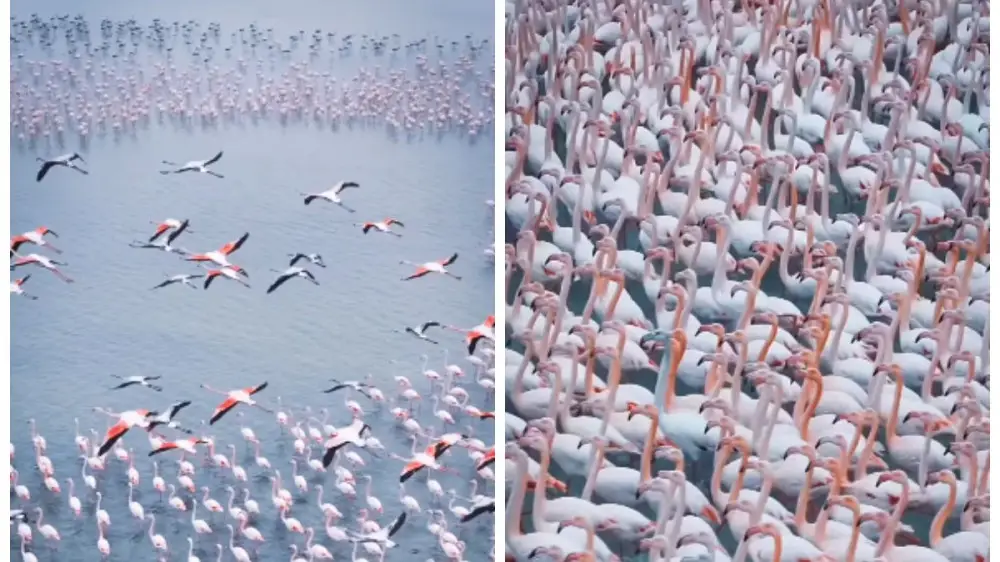 "Осень в Мангистау - уникальное время года, когда на полуострове можно наблюдать множество удивительных природных явлений, в том числе фламинго", - написал блогер.