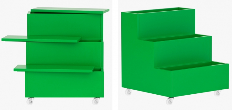 Итальянский бренд выпустил многофункциональную тумбу в ярко-зеленом цвете. Тумба не только обладает мобильностью благодаря колесикам, но и может трансформироваться в самостоятельный дизайнерский предмет. Необычная форма лестницы, в виде которой изготовлено изделие, придает ей новаторский вид и претендует на звание иконы в мире интерьера.